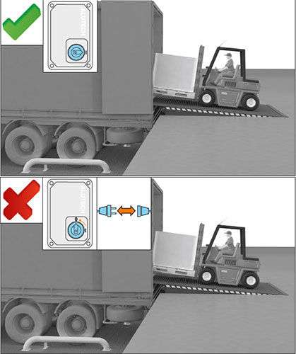 Проведение погрузочно-разгрузочных работ при отключенном питании категорически запрещено. Отключение питания приводит к блокировке гидравлической системы, в результате чего платформа не подстраивается под перепады высоты кузова транспортного средства при проезде погрузчика. Весовые нагрузки при отключенном питании могут стать причиной поломки оборудования.
