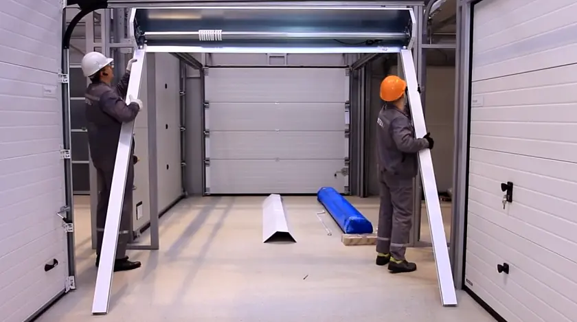 | Полотно из сэндвич-панелей передвигается по направляющим под потолок.