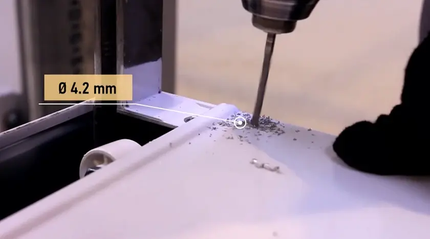 - Разметьте и одновременно просверлите отверстия диаметром 4,2 мм в передних отбортовках боковых крышек и крышке короба (по 2 отверстия с каждой стороны короба для последующей установки заклепок).