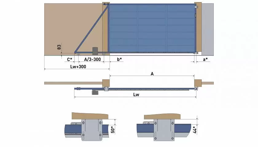 Размеры 50 мм и 44 мм – минимальные расстояния от столба проема до плоскости воротной конструкции.