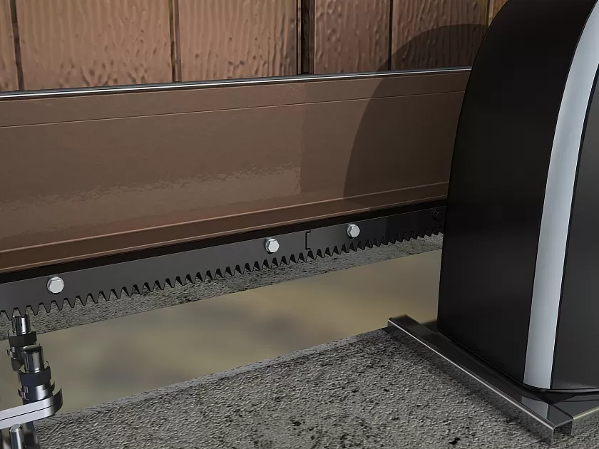 Если кабель уже проведен, монтаж привода для откатных ворот будет простой задачей. При монтаже вместо сварочных работ можно использовать специальный С-профиль. Его достаточно зафиксировать саморезами внизу ворот. После этого в пазы вставляются бобышки. Их нужно передвинуть каждый на нужное место, а затем затянуть болты. Обратите внимание на корректную стыковку 2 реек: если все зубцы полностью совпадают, при работе ворот не будет щелчков и стуков.