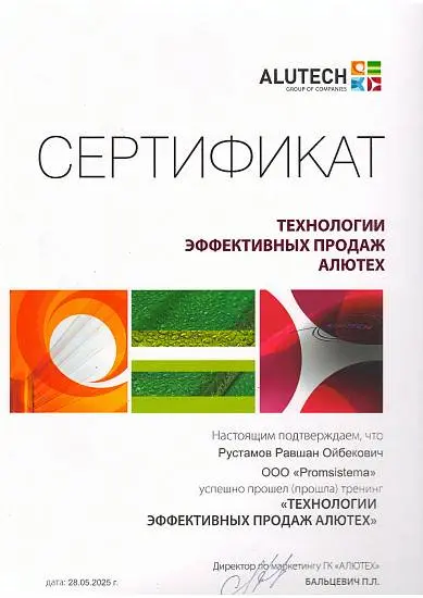 ООО «Prom Sistema» — официальный партнёр ГК «Алютех» в Узбекистане. Мы работаем по всей стране и предлагаем полный ассортимент: роллеты, ворота, автоматику и комплектующие. Наша команда — интернациональная. Общаемся с клиентами на узбекском, русском, белорусском, английском, таджикском, немного на турецком.